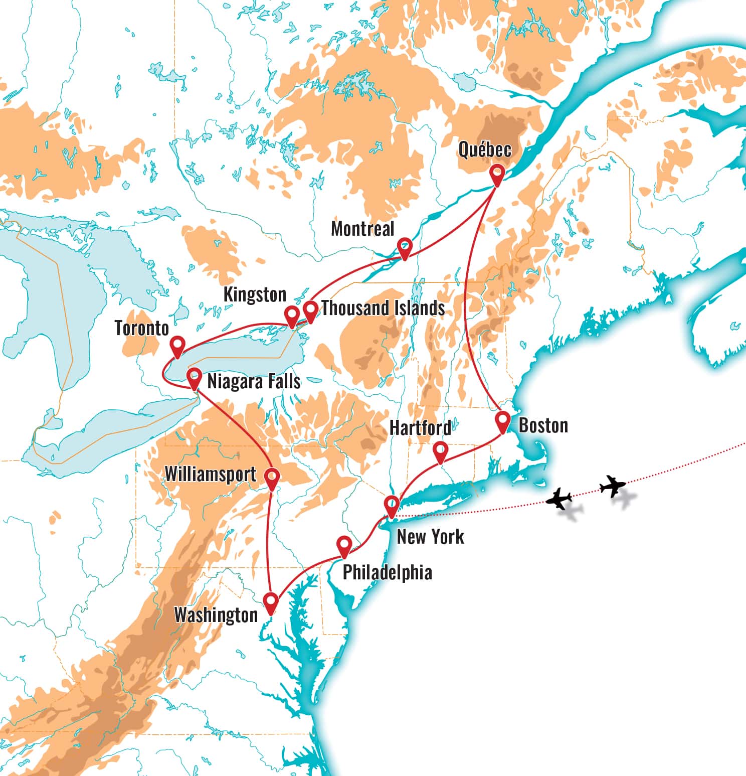 Auf dieser Reise werden wir Sie in die Ursprünge an der Ostküste Nordamerikas, in die Zeit der Mayflower und über den Beginn der Besiedlung Nordamerikas einweihen. Folgen Sie den Spuren der ersten Siedler durch Connecticut und Massachusetts nach Norden. Sie besuchen historische Schauplätze wie Boston, Philadelphia und Washington, die Zeugen der Geschichte sind. Die Spuren und Folgen der europäischen Machtkämpfe zwischen dem Königreich England und Frankreich sind heute noch in Québec und Montreal sichtbar. Für die in Europa religiös Verfolgten haben sich in Pennsylvania neue Möglichkeiten geboten, ihren Glauben in Freiheit praktizieren zu können. Die grandiosen Niagara Wasserfälle oder die unzähligen verträumten Inselchen im St. Lorenz Strom stehen im Kontrast zu den Weltstädten New York und Toronto mit ihrer kosmopolitischen Atmosphäre und ihren imposanten Gebäuden. Die Reise bekommt einen ganz individuellen Akzent, nicht zuletzt durch die gravierenden Gegensätze, die wir Ihnen an der Ostküste Nordamerikas vorstellen werden.